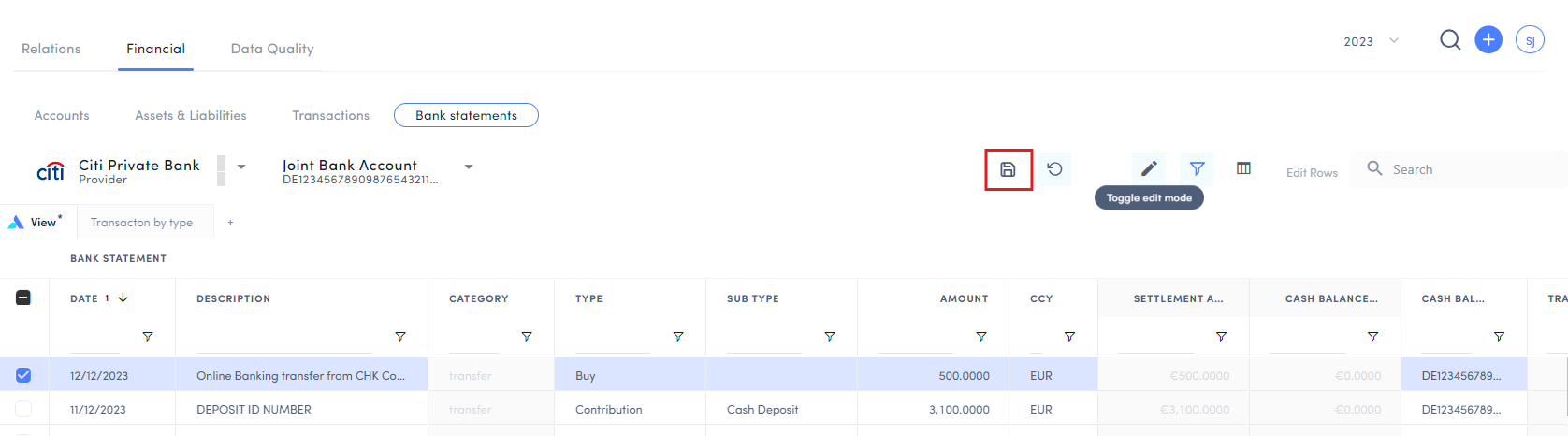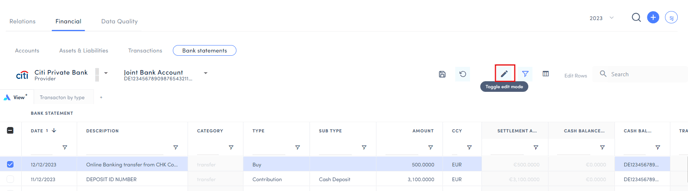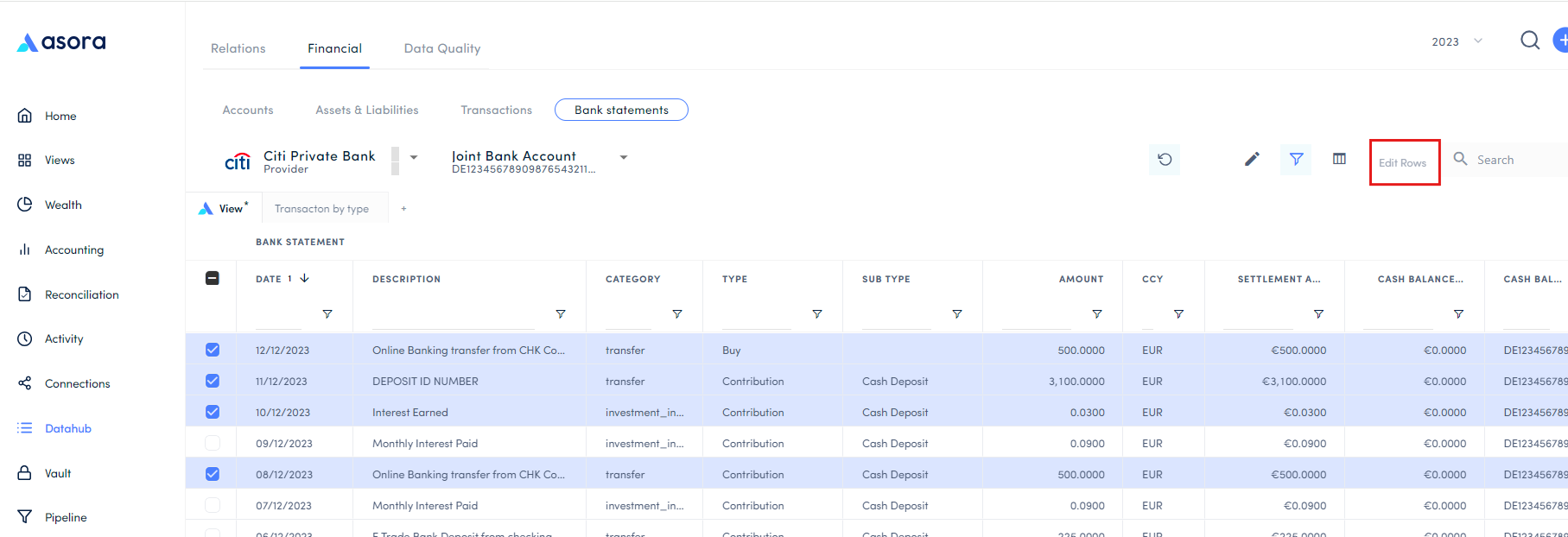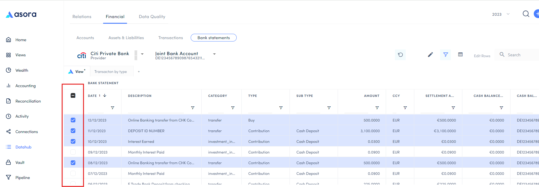 When your bank accounts are connected, all transactions are recorded in Asora under Datahub > Financial > Bank Statements. Unlike custodial accounts, which include detailed asset information, bank accounts only provide settlement details.