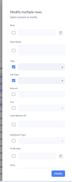 This will open up a list of fields that can be edited for the selected transactions. Select the fields you wish to edit, make the edits, and click on Save.
